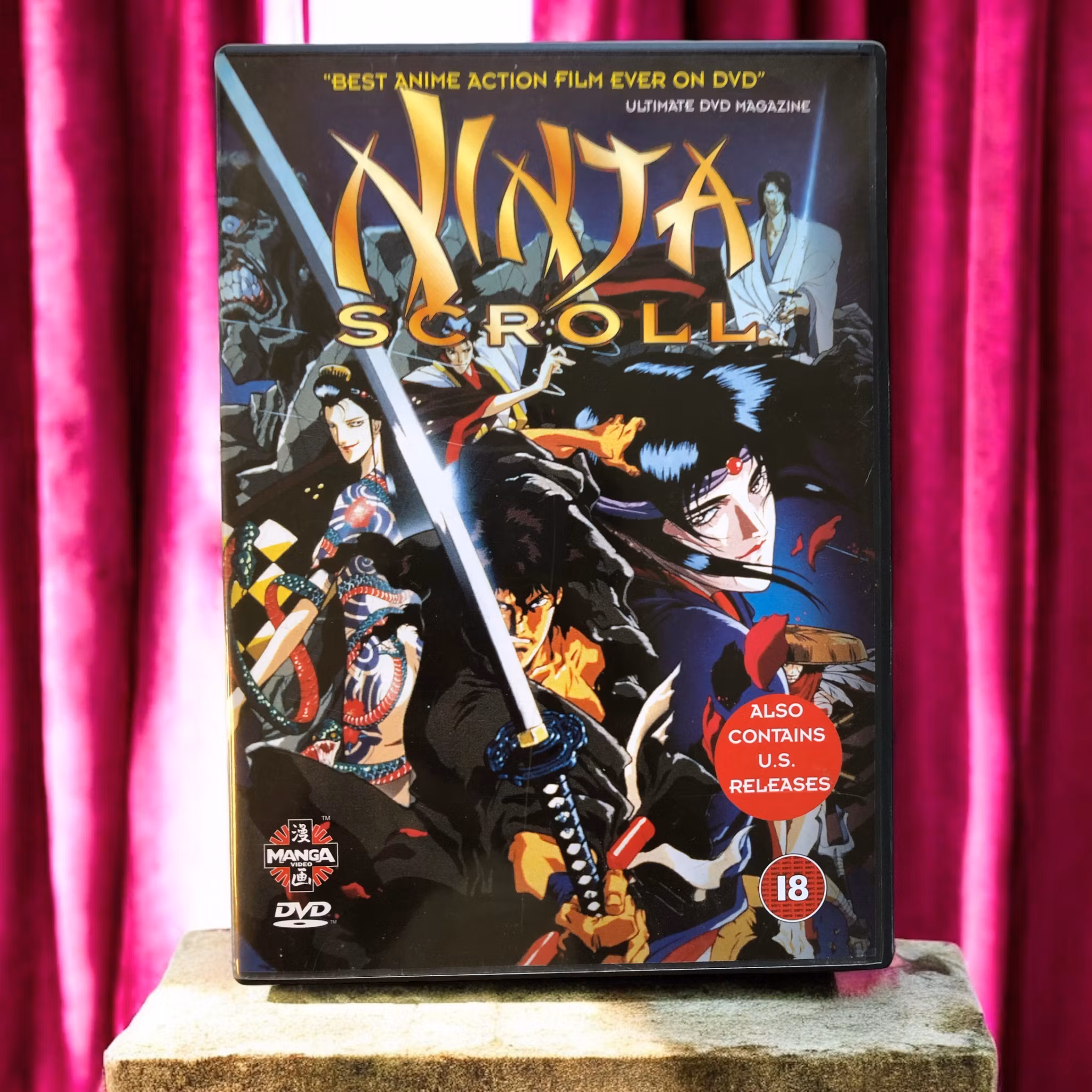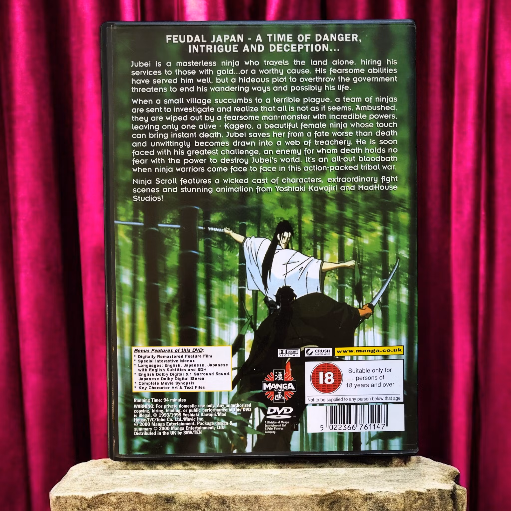 "Ninja Scroll" är en klassisk japansk animerad film som har blivit ett viktigt verk inom anime-genren. Filmen utspelar sig i det feodala Japan och följer Jubei Kibagami (Kazuya Tatekabe), en enslig och mästerlig ninja som får i uppdrag att avslöja en konspiration som hotar att destabilisera hela landet. Efter att ha räddat Kagero (Emi Shinohara), en kvinna med en mörk hemlighet, från en dödlig fiende, dras Jubei in i en komplex och blodig konflikt med en grupp av övermänskliga ninjor som kallas "The Eight Devils of Kimon". Dessa fruktade krigare, var och en med sina unika och skrämmande förmågor, utgör en allvarlig fara för Jubei och hans allierade.