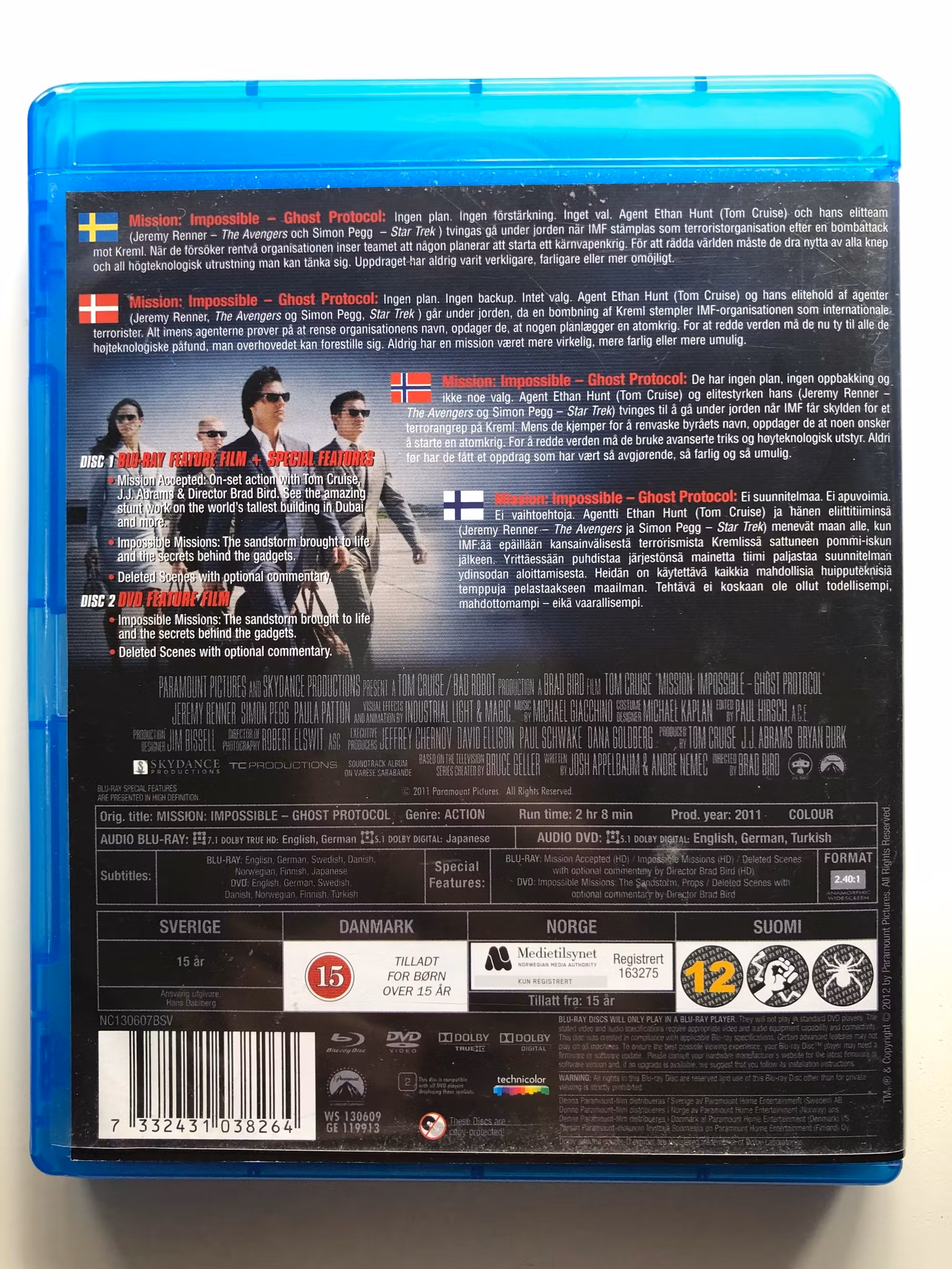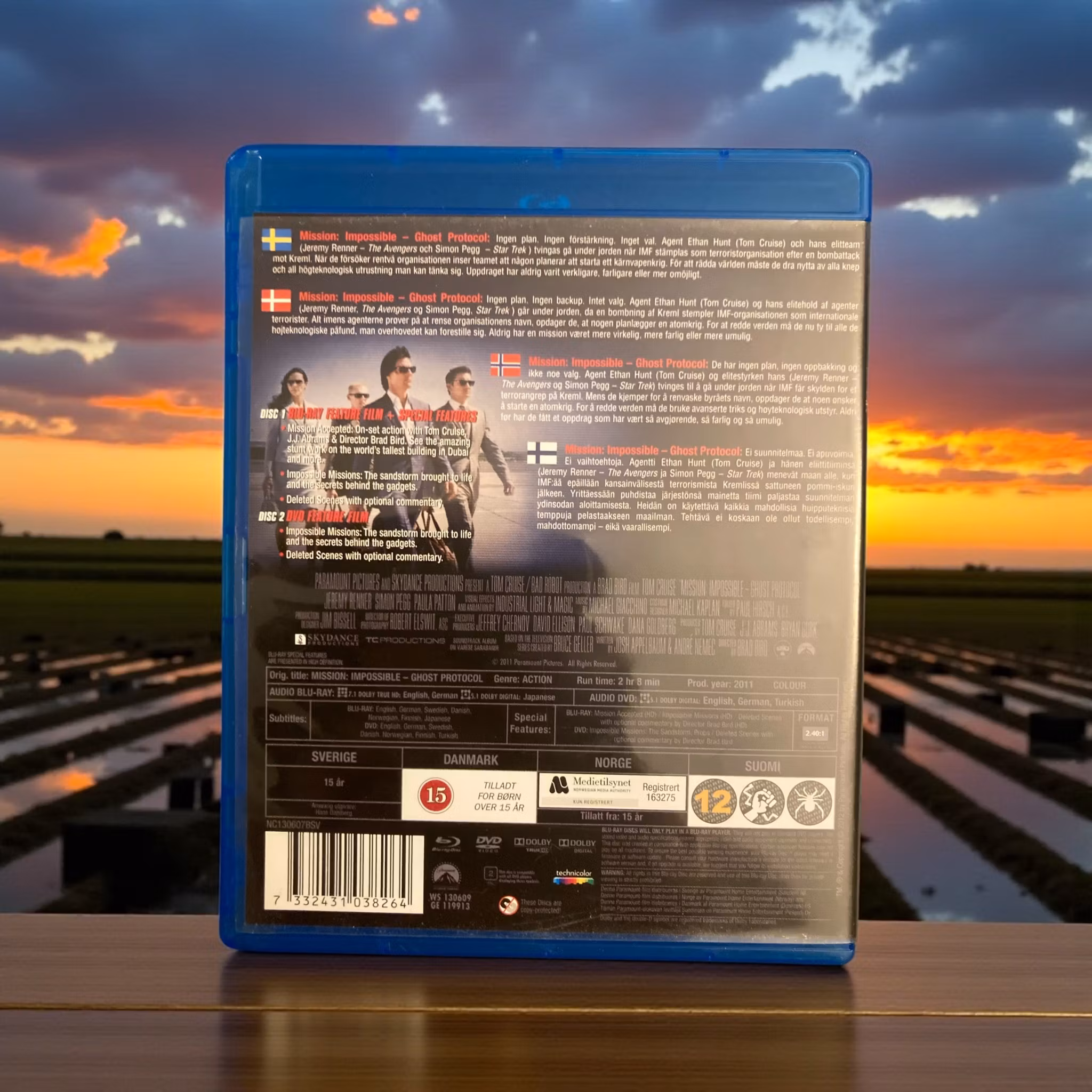 Beskrivning av filmen: "Mission: Impossible - Ghost Protocol" är en actionfylld äventyrs- och thrillerfilm från 2011, regisserad av Brad Bird. I denna fjärde del i Mission: Impossible-serien återvänder Ethan Hunt (Tom Cruise) och hans team till handling när IMF (Impossible Mission Force) anklagas för en explosion som förstört Kreml i Moskva. Eftersom organisationen är desavouerad och på flykt, tar teamet på sig uppgiften att rensa sina namn och stoppa en galen atomvapenentusiast, Kurt Hendricks (Michael Nyqvist), från att starta en global katastrof. Filmen tar tittarna med på en vild åktur genom olika internationella platser, inklusive Dubai och Mumbai, med spektakulära stunts och imponerande visuella effekter. "Ghost Protocol" är känt för sina adrenalinfyllda actionscener, komplexa intriger och karismatiska rollbesättning, vilket gör den till en av de mest hyllade filmerna i serien.