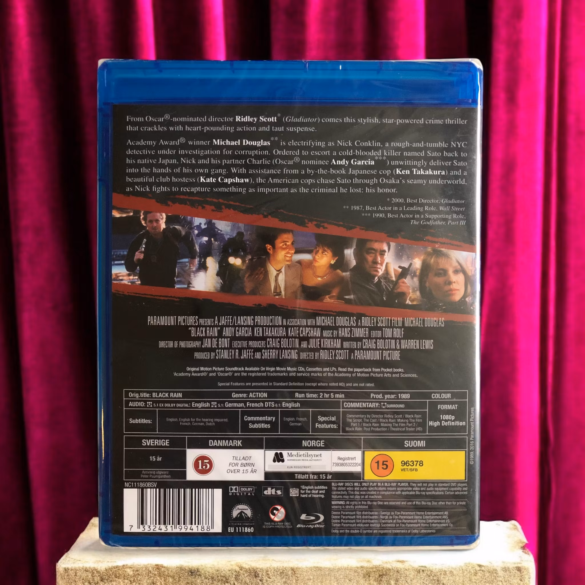 "Black Rain" (1989) är en amerikansk kriminalthriller regisserad av Ridley Scott. Filmen är en actionfylld berättelse om två New York-poliser som dras in i en internationell jakt efter en japansk yakuza-mördare, vilket leder dem till Osaka, Japan.