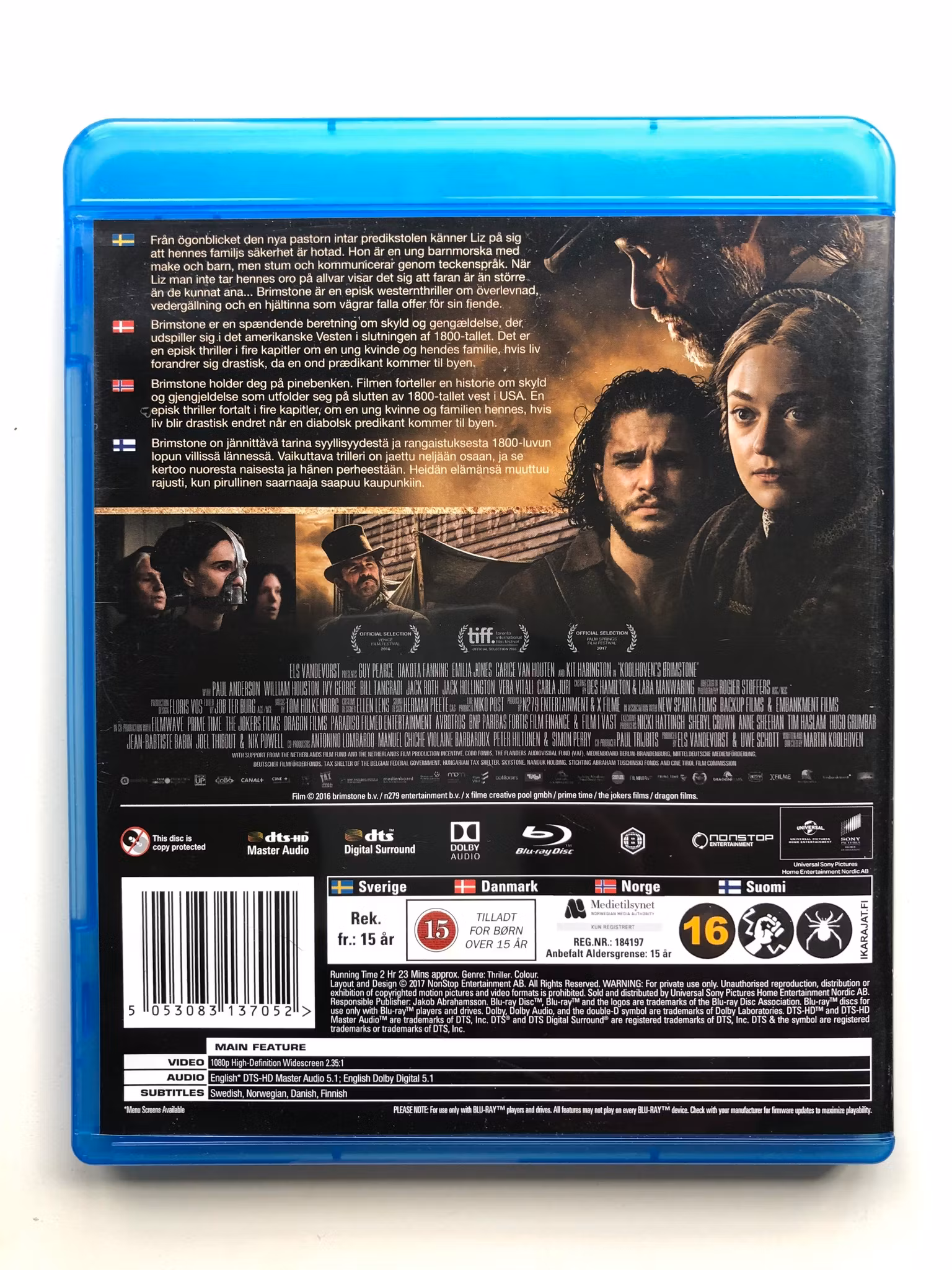 "Brimstone" är en intensiv och gripande thriller som utspelar sig i vilda västern. Handlingen följer Liz (spelad av Dakota Fanning), en ung kvinna som tvingas konfrontera sin mörka och våldsamma förflutna när en ondskefull predikant (spelad av Guy Pearce) kommer till hennes stad. Predikanten har en personlig vendetta mot Liz, och hans ankomst sätter igång en kedja av händelser som hotar att förstöra hennes liv och dem hon älskar.