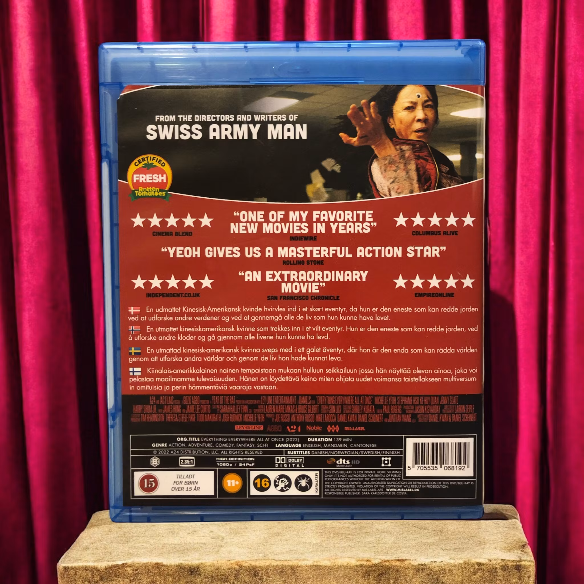 Everything Everywhere All at Once (2022) är en banbrytande och genreöverskridande film som tar publiken på en galen och tankeväckande resa genom multiversum. Berättelsen följer Evelyn Wang (Michelle Yeoh), en överarbetad och frustrerad kvinna som driver ett litet tvätteri tillsammans med sin man Waymond (Ke Huy Quan). Evelyn är fast i sin monoton och kämpar med livets utmaningar, inklusive sin krävande far Gong Gong (James Hong) och sin dotter Joy (Stephanie Hsu), vars relation är spänd och komplex.