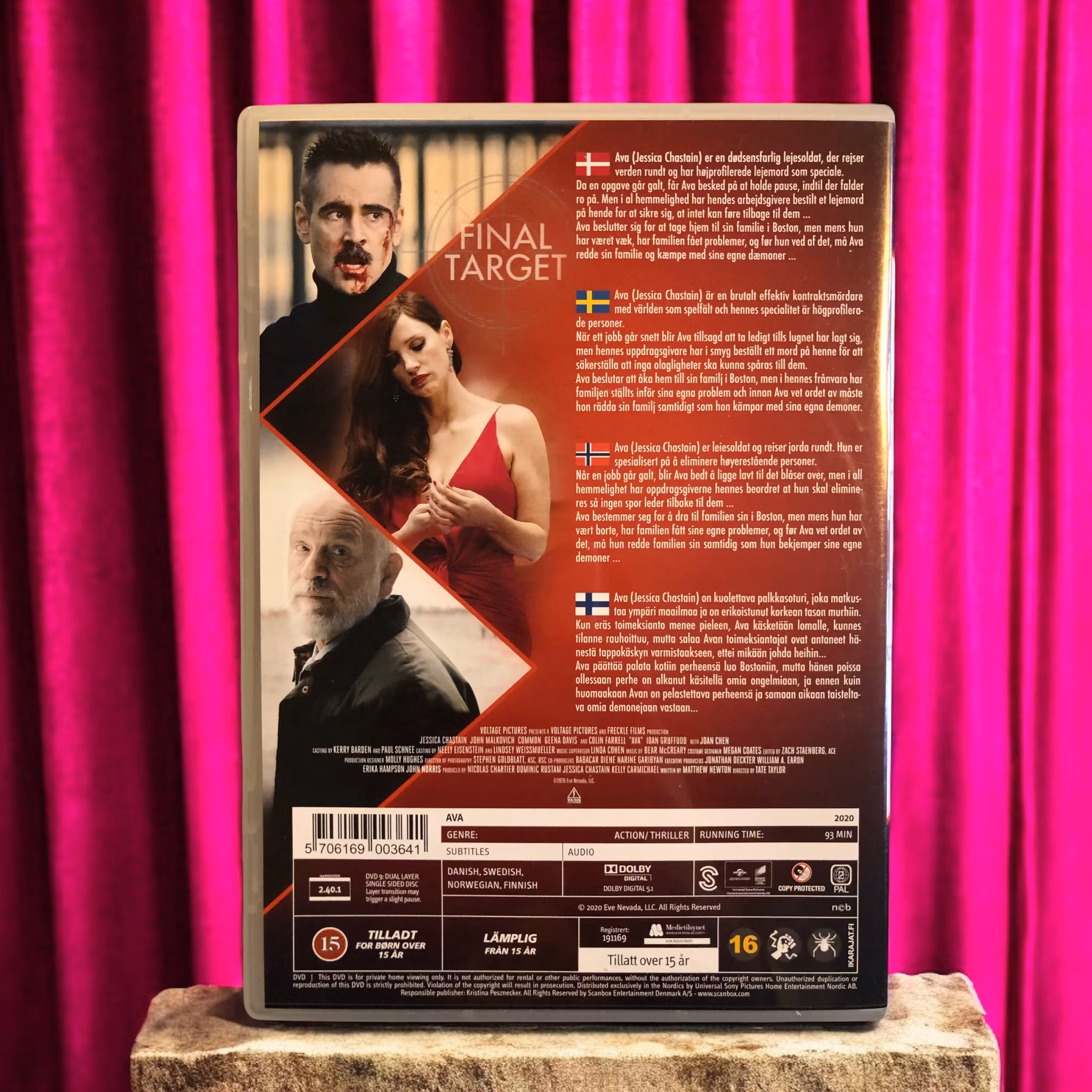 Final Target, med originaltiteln Ava, är en action-thriller som följer Ava Faulkner (Jessica Chastain), en högutbildad lönnmördare som arbetar för en hemlig organisation. Efter år av farliga internationella uppdrag börjar Ava ifrågasätta både sina mål och sina egna moraliska val, vilket gör henne till en säkerhetsrisk för sin arbetsgivare. När ett uppdrag går snett och hon misslyckas, beordras hennes egen likvidering av Simon (Colin Farrell), en ledande figur inom organisationen och en tidigare mentor.