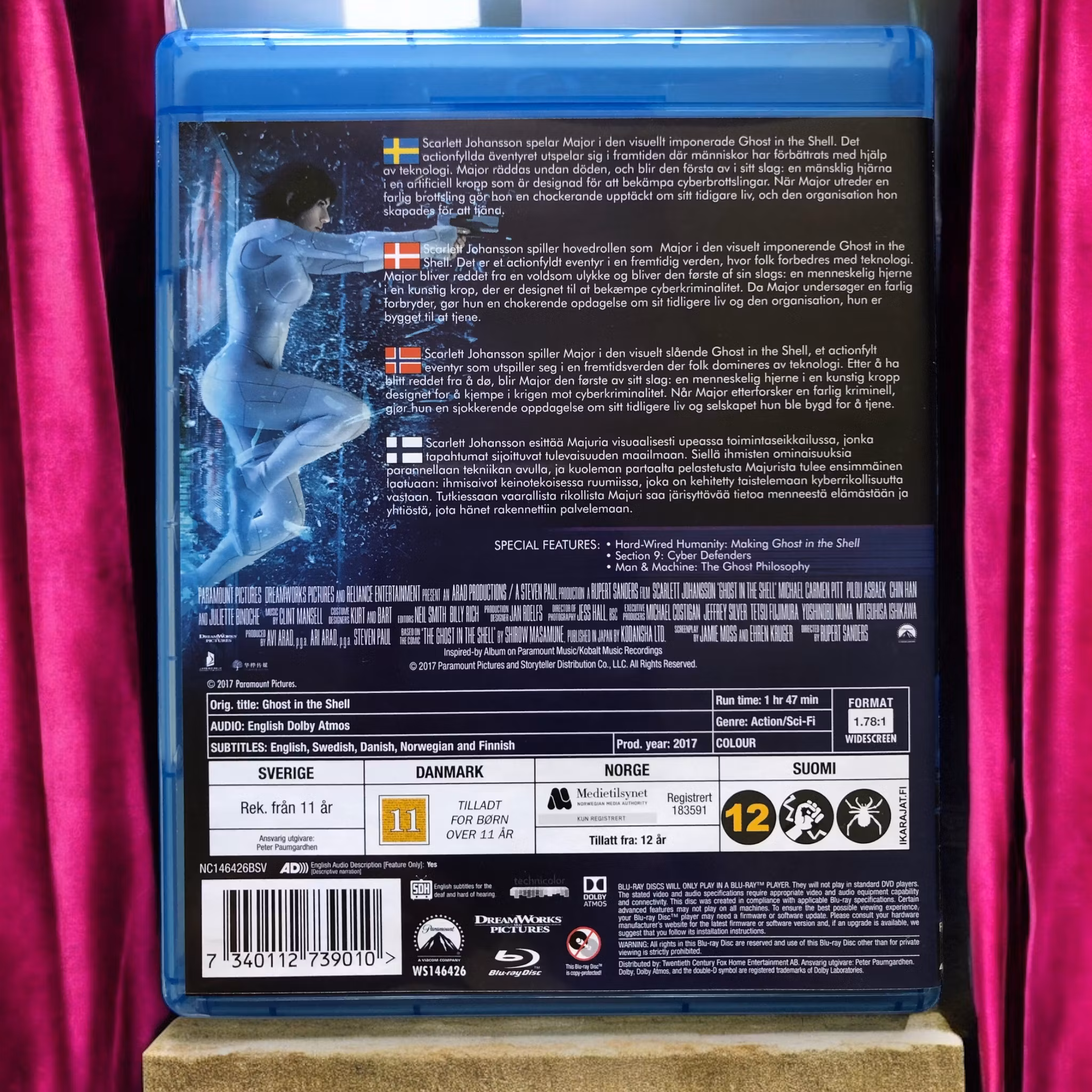 "Ghost in the Shell" är en live-action-adaption av den ikoniska japanska mangan och anime-filmen med samma namn. Filmen utspelar sig i en framtid där gränserna mellan människa och maskin är suddiga. Major (Scarlett Johansson) är den första av sitt slag – en mänsklig hjärna innesluten i en syntetisk kropp, skapad för att vara det perfekta vapnet. När hon leder elitstyrkan Section 9 mot farliga cyberbrottslingar, börjar hon ifrågasätta sitt förflutna och vem hon egentligen är. Under jakten på en mystisk fiende som hotar att förstöra det artificiella liv hon känner till, upptäcker hon en konspiration som sträcker sig bortom vad hon någonsin kunnat föreställa sig. Filmen är en visuellt slående resa genom en dystopisk framtid, fylld med både action och filosofiska frågor om identitet och mänsklighet.