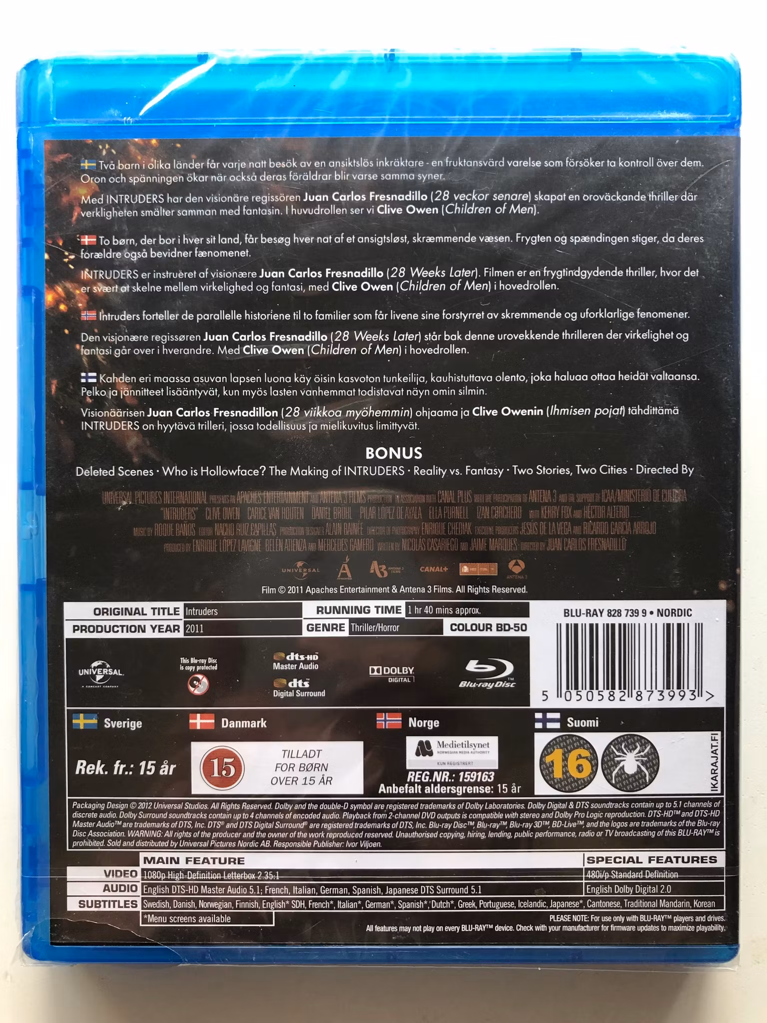 Beskrivning av filmen: "Intruders" är en psykologisk skräckthriller som följer två parallella berättelser om två familjer som hemsöks av en mystisk varelse kallad "Hollow Face." I Spanien upptäcker en ung pojke, Juan, att en mörk figur gömmer sig i hans garderob och försöker ta över hans kropp. Samtidigt, i England, plågas en ung flicka vid namn Mia av en liknande varelse som dyker upp i hennes drömmar och snart börjar påverka hennes verkliga liv.