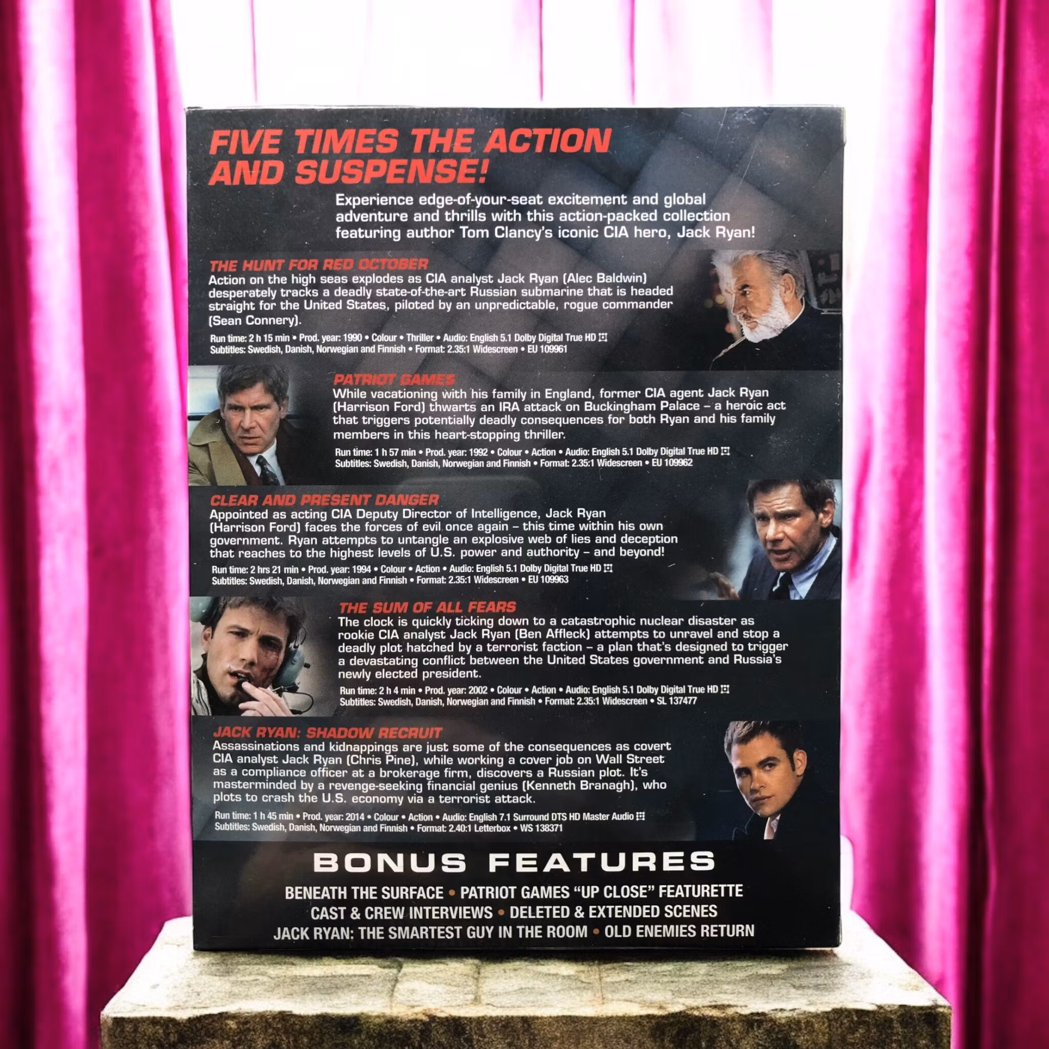Beskrivning: "The Hunt for Red October" är den första filmatiseringen av Tom Clancys Jack Ryan-karaktär. Historien följer CIA-analytikern Jack Ryan (Alec Baldwin) som försöker förhindra ett eventuellt kärnvapenkrig när en sovjetisk ubåtskapten (Sean Connery) tros planera att hoppa av till USA. Filmen är en spännande blandning av kalla kriget-politik, sjöstridstaktik och nervkittlande intriger.