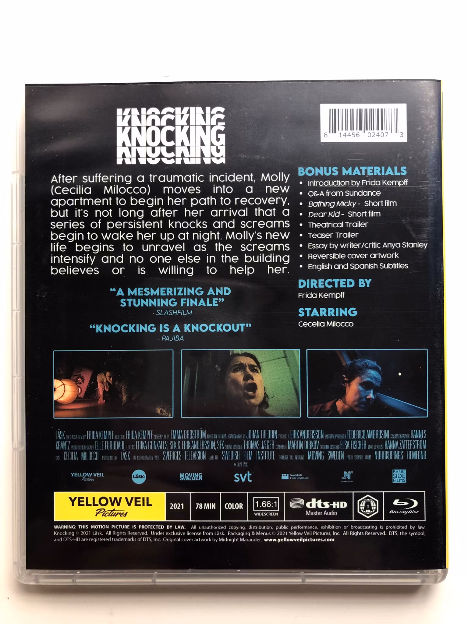Beskrivning av filmen: "Knocking" är en dramatisk skräck- och mysteriefilm från 2021, regisserad av Frida Kempff. Filmen följer huvudpersonen Molly, spelad av Cecilia Milocco, som flyttar till en ny lägenhet för att börja om efter en traumatisk händelse. Men snart börjar hon höra mystiska och oroande ljud från grannlägenheten ovanför, vilket driver henne till att försöka avslöja den hemlighet som döljer sig bakom dörrarna.
