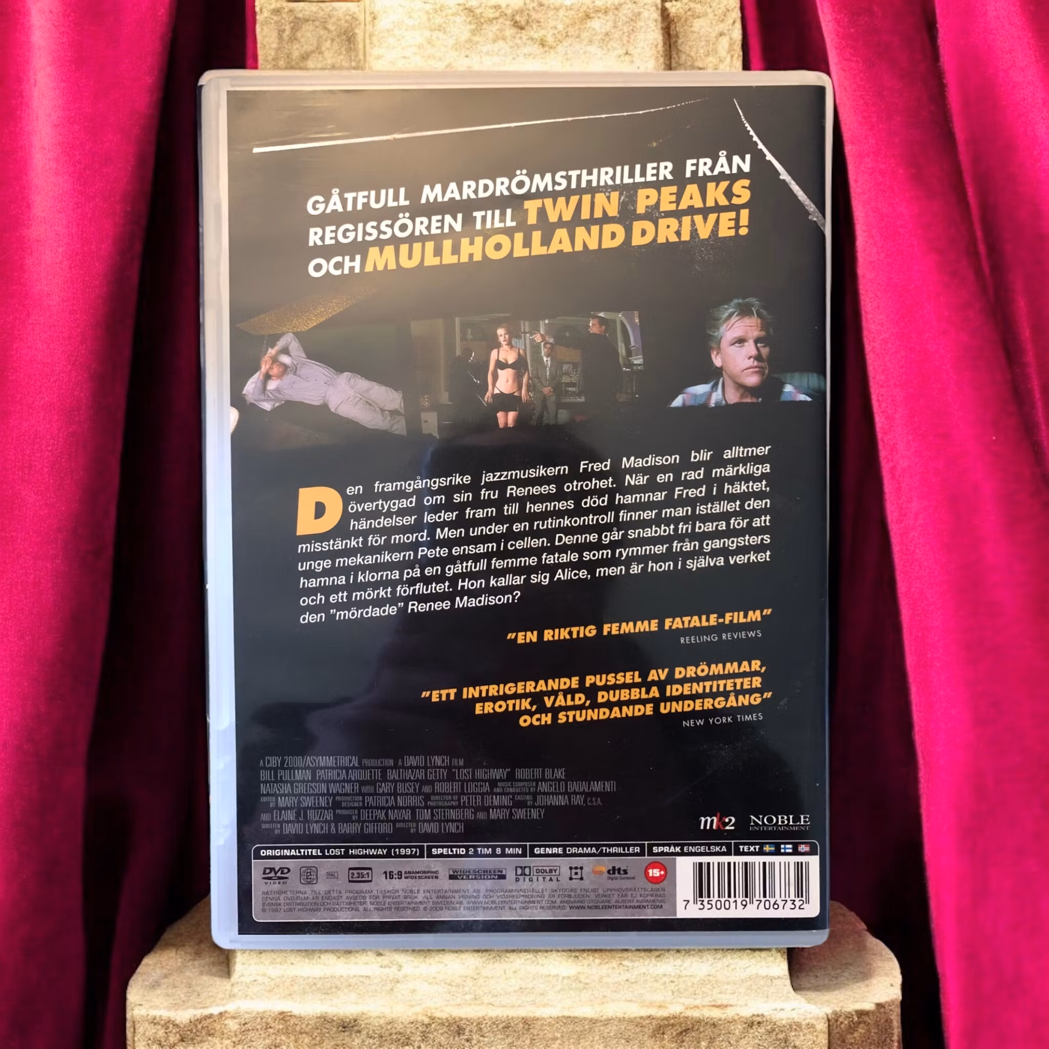 "Lost Highway" är en surrealistisk mysterium-thriller regisserad av David Lynch. Filmen följer saxofonisten Fred Madison (Bill Pullman), som lever ett till synes vanligt liv med sin fru Renee (Patricia Arquette). Deras tillvaro störs dock när de börjar få mystiska videokassetter levererade till sitt hem, som visar inspelningar av dem medan de sover.