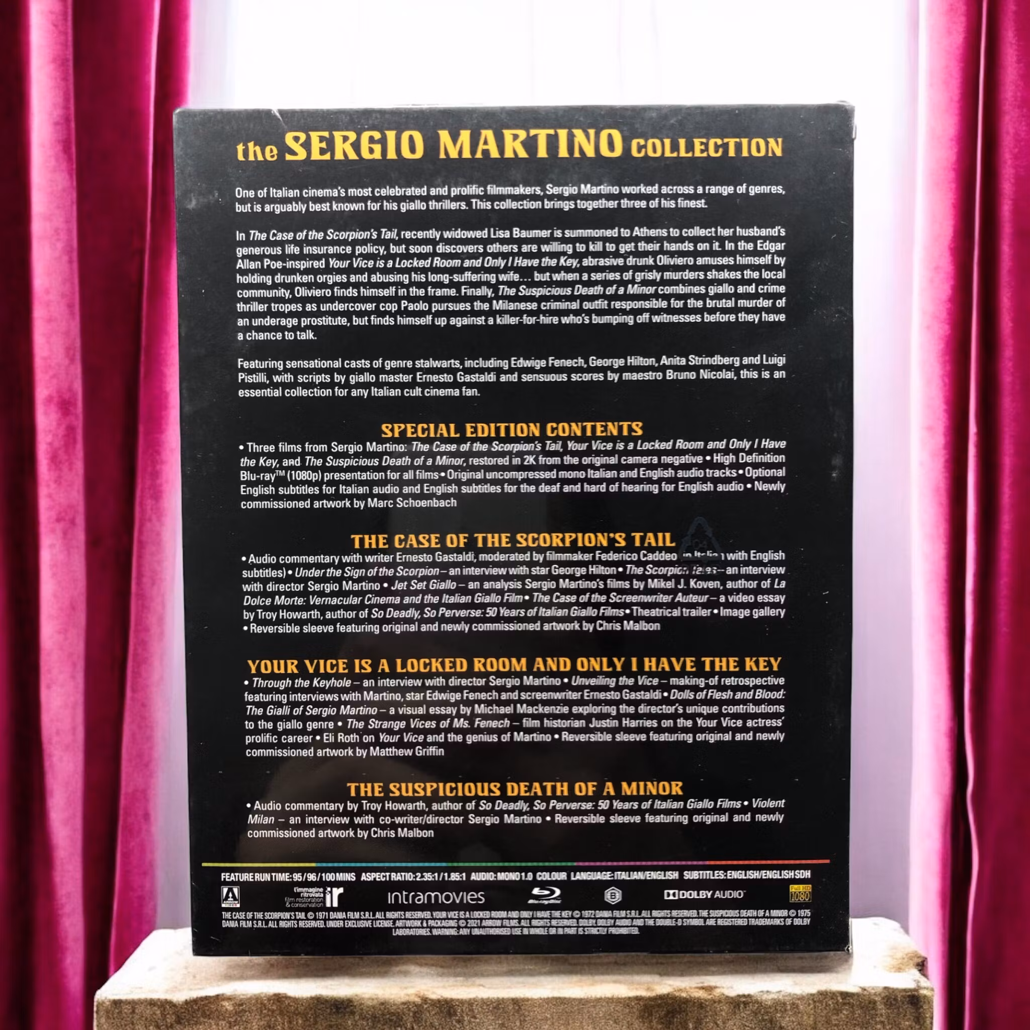 Beskrivning: "Your Vice Is a Locked Room and Only I Have the Key" är en psykologisk skräckthriller löst baserad på Edgar Allan Poes novell "The Black Cat." En plågad författare, hans instabila hustru och den lockande systerdottern dras in i ett nät av förräderi, mord och förtärande begär. Med en tät atmosfär och laddad stämning räknas filmen som en av Sergio Martinos mest framträdande bidrag inom giallo-genren.