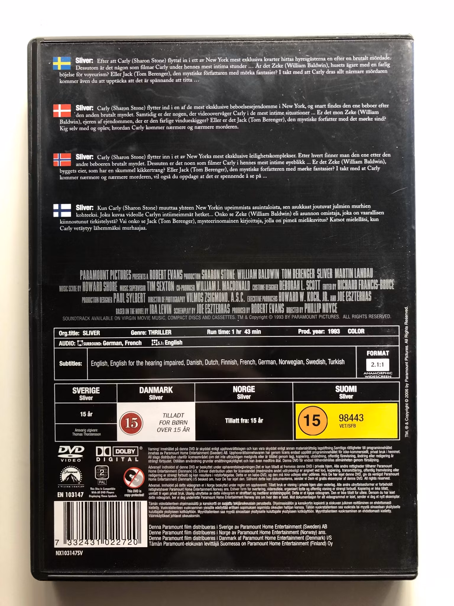 Beskrivning av filmen: "Sliver" är en amerikansk thriller från 1993, regisserad av Phillip Noyce. Filmen är baserad på en roman av Ira Levin och följer Carly Norris (spelad av Sharon Stone), en framgångsrik bokredaktör som flyttar in i en exklusiv lägenhetsbyggnad i New York.