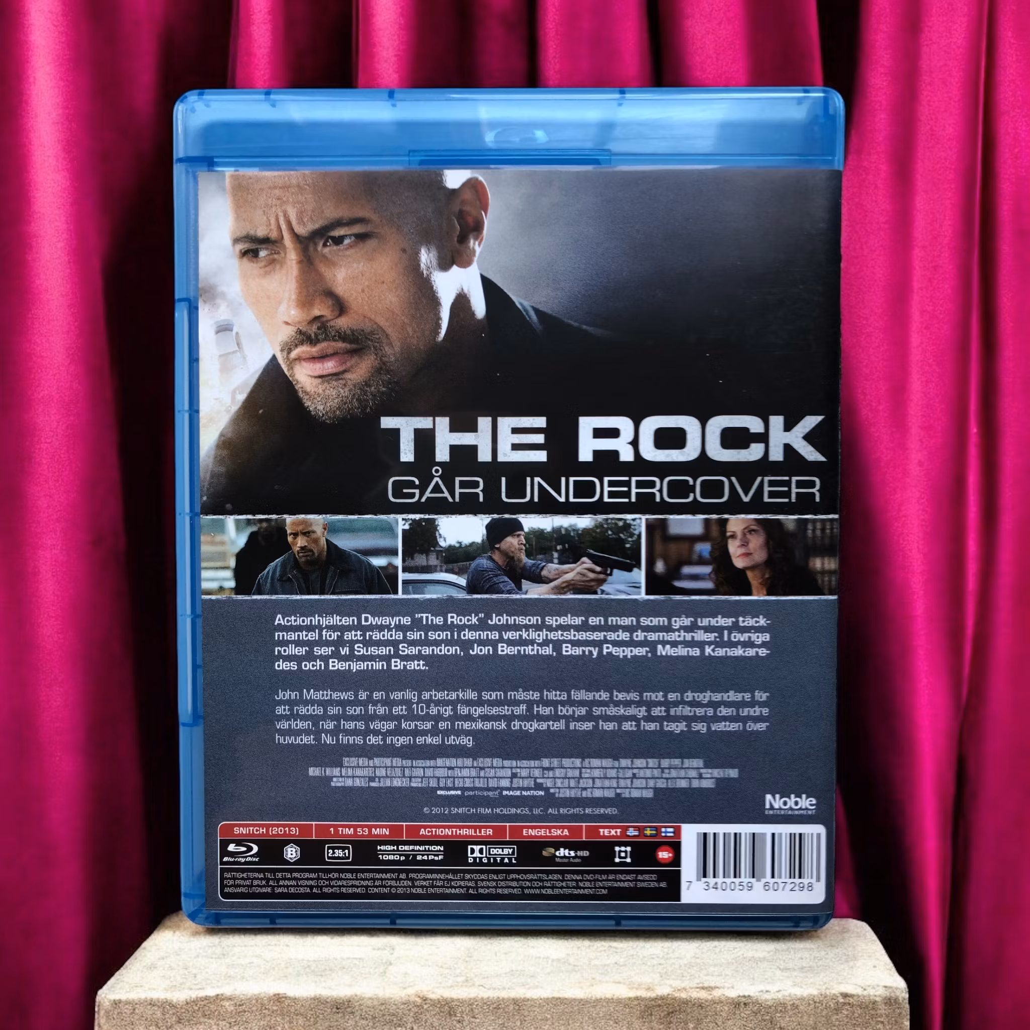 "Snitch" är en actiondrama-thriller regisserad av Ric Roman Waugh och baserad på verkliga händelser. Filmen följer John Matthews (Dwayne Johnson), en framgångsrik affärsman vars son, Jason (Rafi Gavron), blir orättvist dömd för ett brott som han inte begått. När Jason får en lång fängelsestraff på grund av en drogrelaterad anklagelse, bestämmer sig John för att ta saken i egna händer för att rädda sin son. För att få Jason frigiven, går John undercover och infiltrerar en drogkartell för att samla bevis och avslöja större brottsliga nätverk. Filmen utforskar teman som familjeband och rättvisa, med Dwayne Johnson som levererar en kraftfull prestation som en man som riskerar allt för sin familj. "Snitch" kombinerar intensiva actionsekvenser med en dramatisk berättelse om personlig uppoffring och kampen mot ett korrumperat system. Filmen har fått blandade recensioner för sin balans mellan action och drama samt för Johnsons roll som en oväntad hjälte.