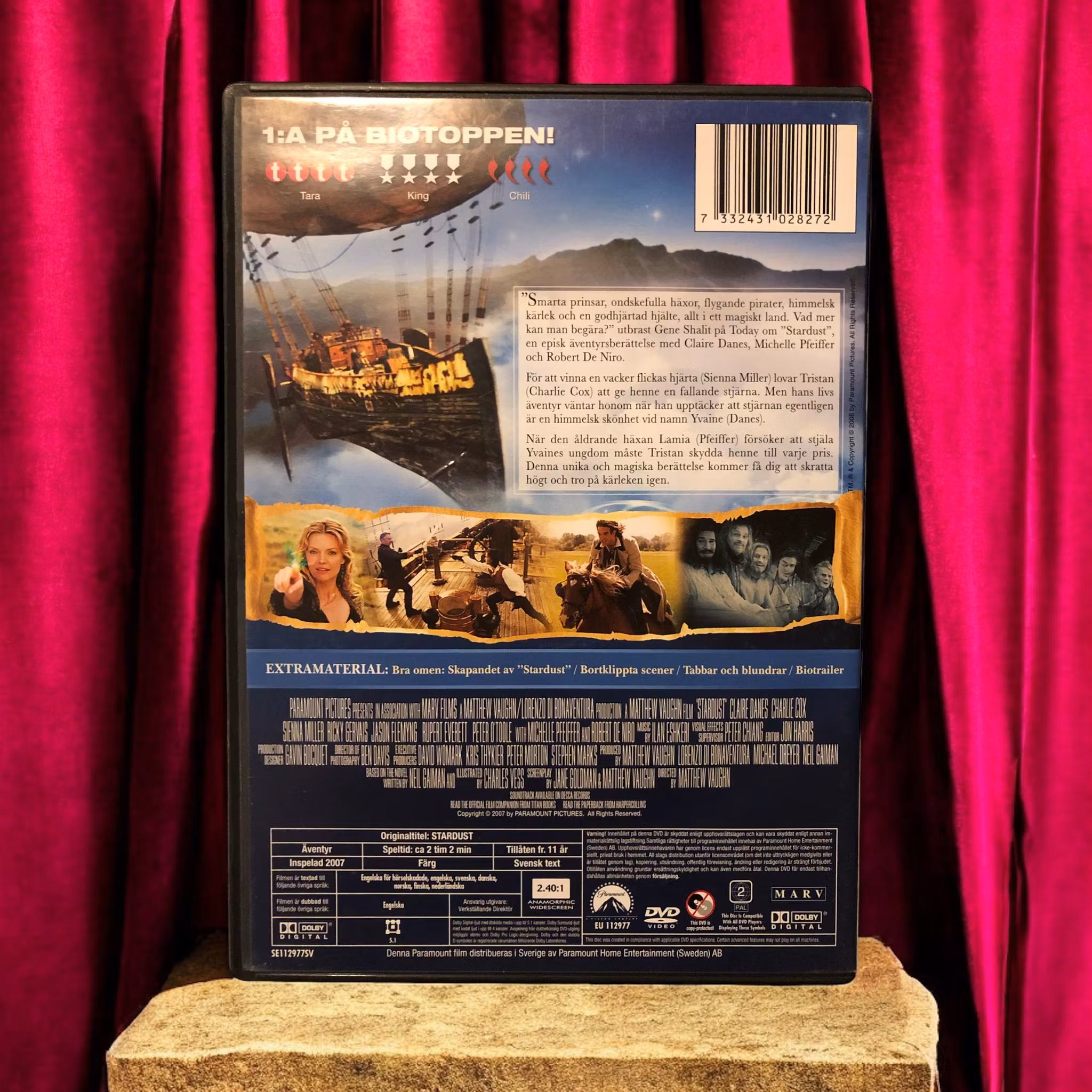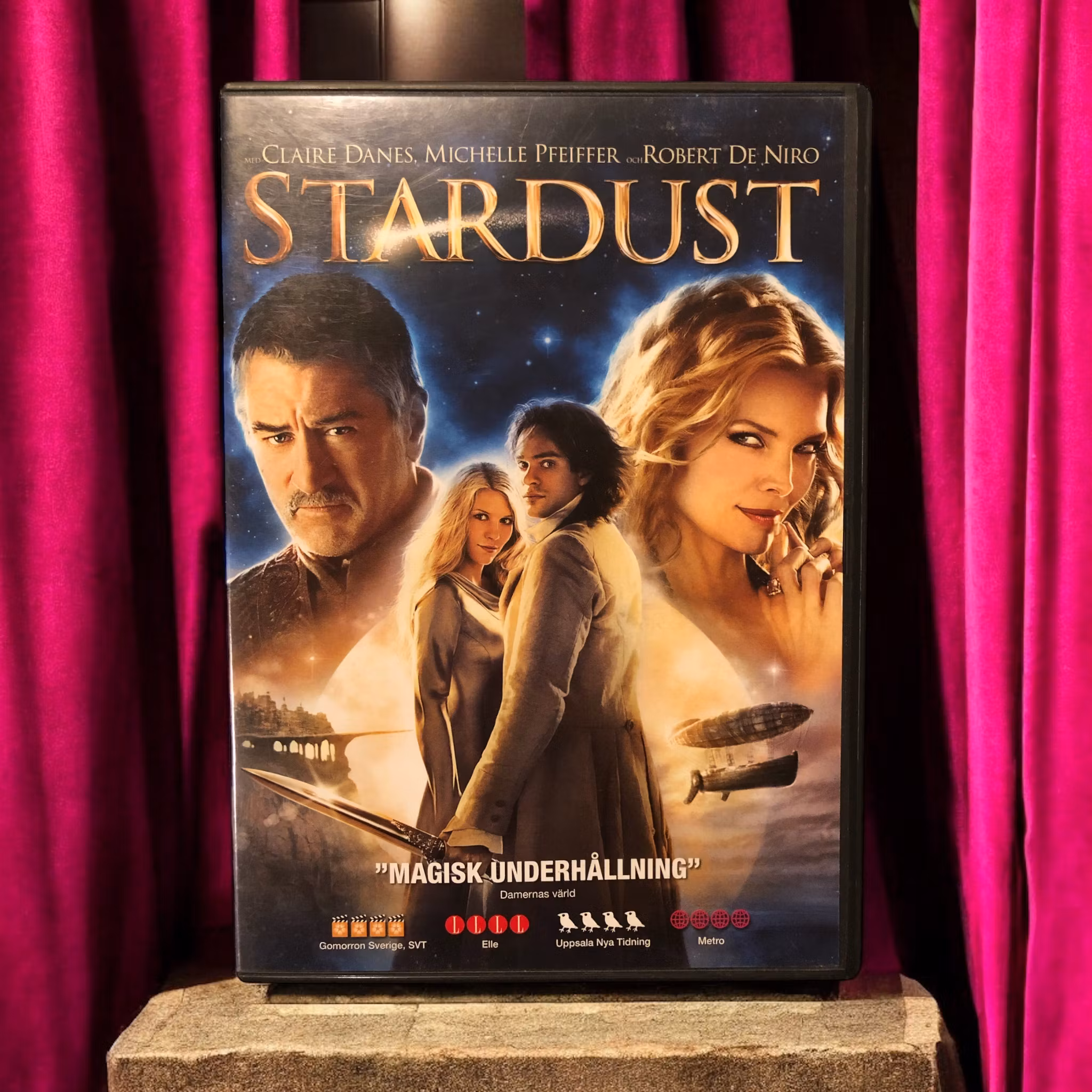 "Stardust" är en äventyrsfantasyfilm från 2007, regisserad av Matthew Vaughn. Filmen är baserad på Neil Gaimans roman med samma namn och utspelar sig i en magisk värld där en ung man vid namn Tristan Thorn, spelad av Charlie Cox, ger sig ut på en farofylld resa för att hitta en fallande stjärna och vinna hjärtat av sin älskade. Stjärnan, spelad av Claire Danes, visar sig dock vara en levande kvinna med egna önskningar och faror som hotar dem båda. Med en fascinerande blandning av äventyr, romantik och humor, och stödda av en ensemble av erfarna skådespelare som Michelle Pfeiffer och Robert De Niro, levererar "Stardust" en underhållande och magisk berättelse som tilltalar både ung och gammal.