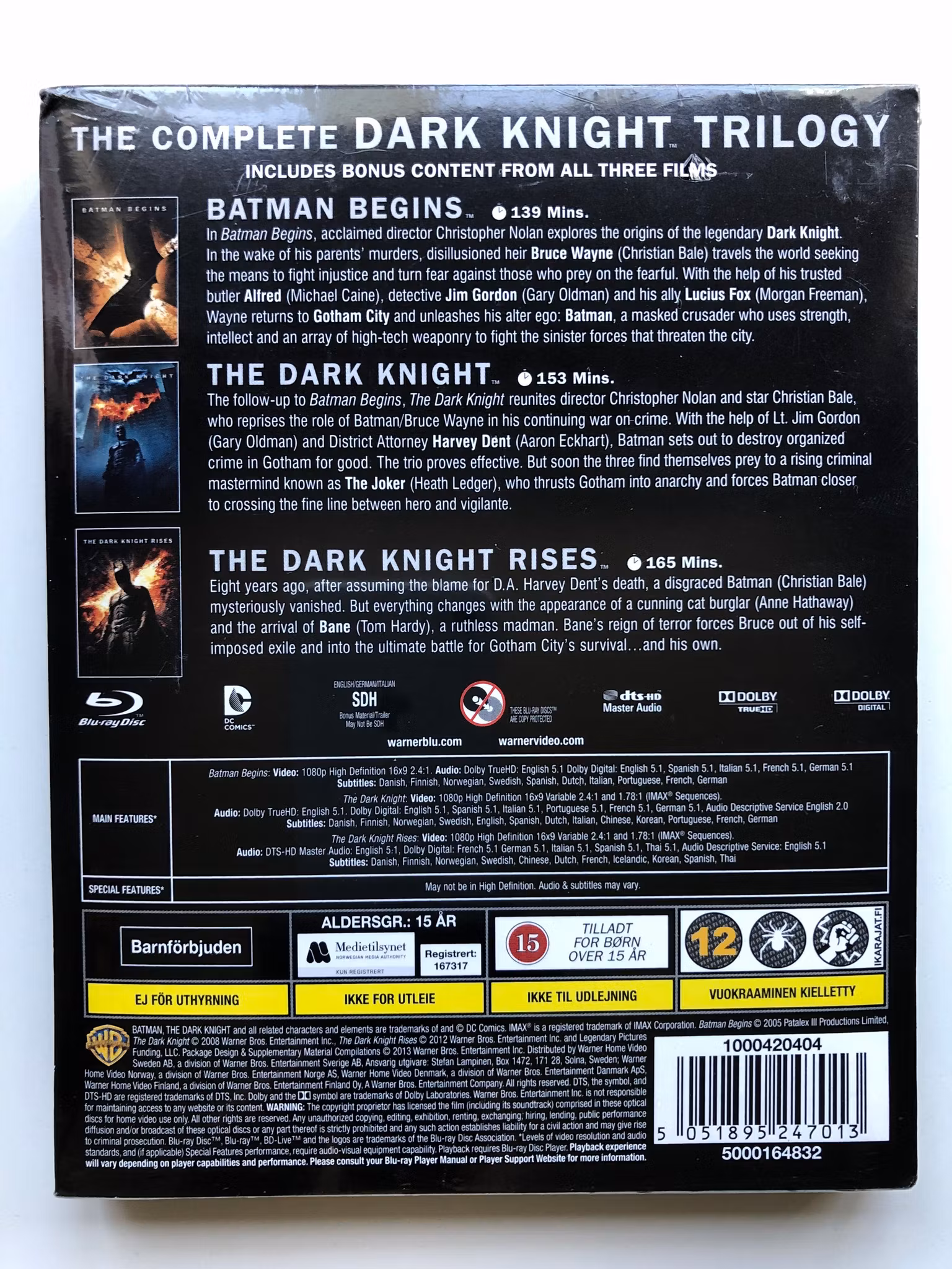 "The Dark Knight Trilogy" är en serie av tre amerikanska superhjältefilmer som regisserades av Christopher Nolan. Filmerna är baserade på DC Comics-karaktären Batman och följer hans tidiga år som brottsbekämpare i Gotham City. Här är en översikt över de tre filmerna: