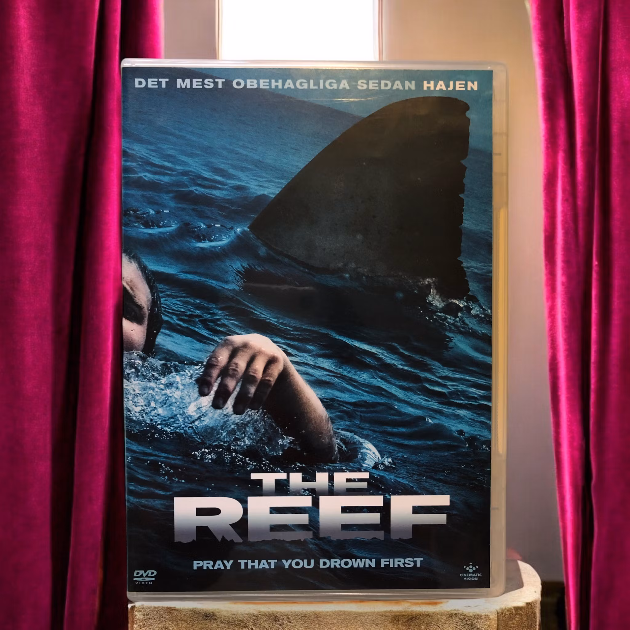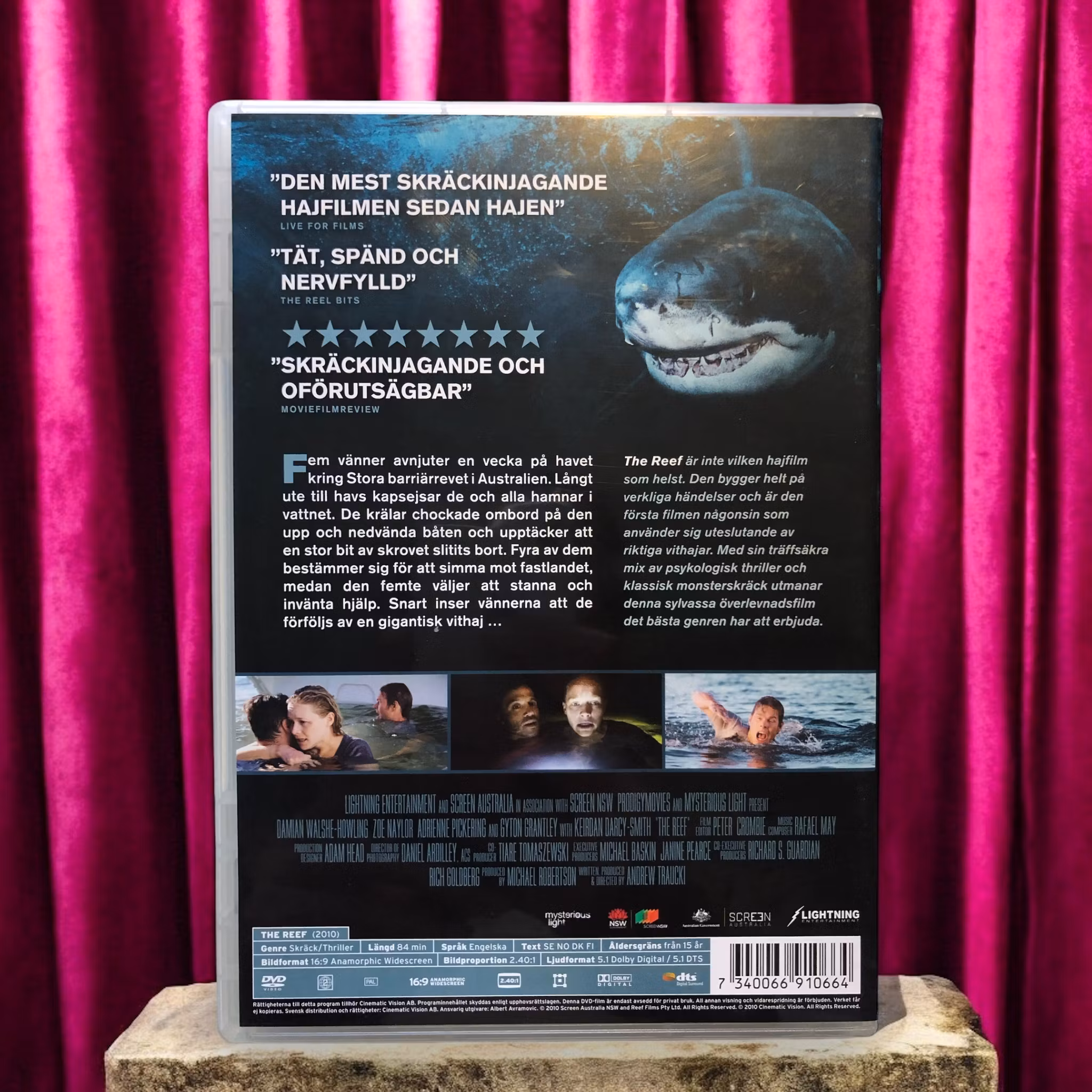 "The Reef" är en australiensisk skräckfilm som följer en grupp vänner som är på en seglingsresa längs den stora barriärrevet. När deras båt kapsejsar tvingas de fatta ett svårt beslut: stanna kvar på den sjunkande båten eller simma till land genom hajinfesterade vatten. Gruppen bestämmer sig för att försöka simma till säkerhet, men de inser snart att de blir förföljda av en stor vithaj. Filmen bygger på verkliga händelser och är känd för sin intensiva spänning och realistiska skildring av överlevnad under extrema förhållanden.